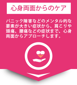 パニック障害などのメンタル的な要素が大きい症状から、肩こりや頭痛、腰痛などの症状まで、心身両面からアプローチして解決のお手伝いをさせて頂きます。