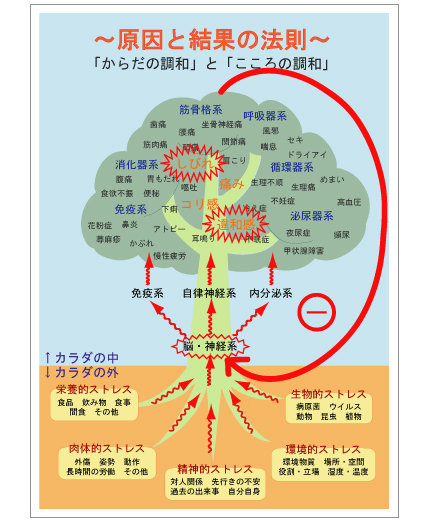 右の図にありますように、カラダは健康な状態を維持するために、脳・神経系を最高位に、内分泌系・自律神経系・免疫系の3つのシステムを持っています。脳・神経系のバランスが崩れると、そのシステムがうまく働かず、結果さまざまな症状が出てきます。