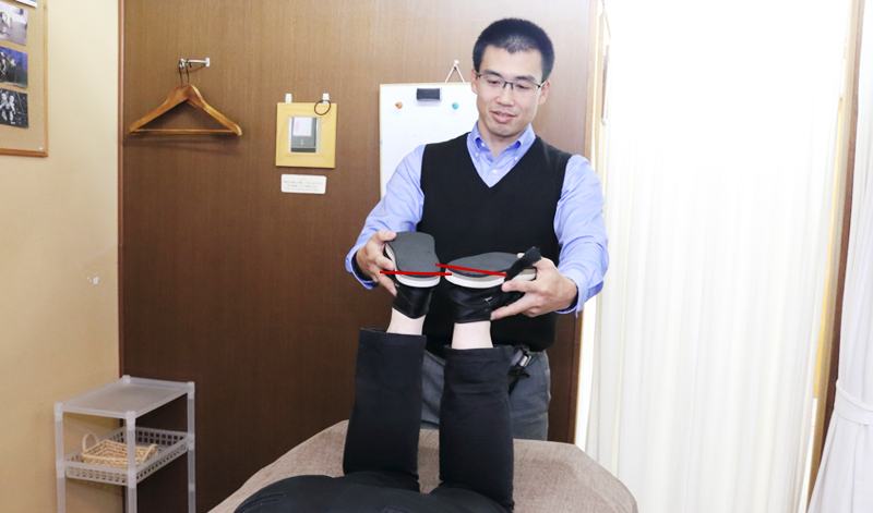 次に足の長さの変化を見ながら、うまく機能していない神経系に対して、アクティベータ器を用いて、小さな振動を与え活性化していきます。