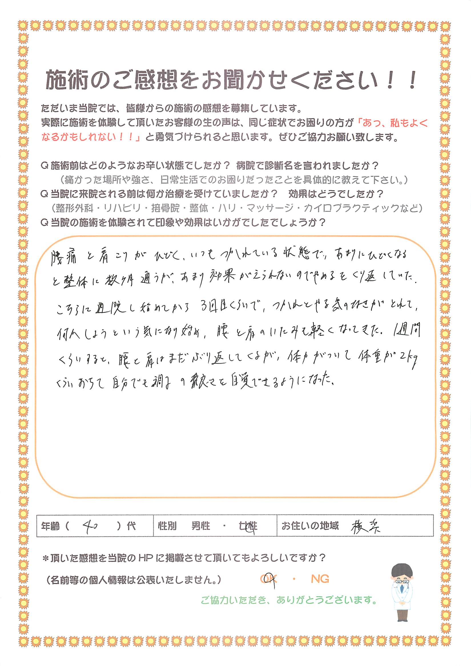 疲労感、腰痛と肩こりでお困りの方から、先日、施術のご感想を頂きましたので、ご紹介します。