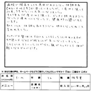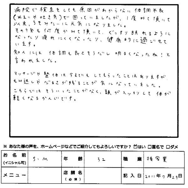 以前、原因不明の体調不良(めまいや吐き気)でお困りだった方から頂いた感想をご紹介します。