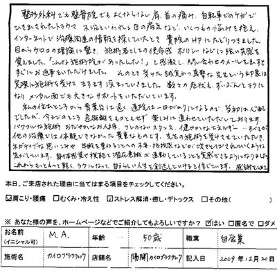 整形外科でも接骨院でもよくならない肩・首の痛み、自転車でのケガで引き出されたトラウマ、不治といわれる目の病気などで、いくつもの悩みを抱え、インターネットで治療関連の情報を探しているとき、貴院のHPにたどりつきました。