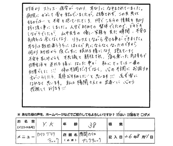 人生で初めての整体でしたので、ドキドキしながらでしたが、山中先生の優しい笑顔を見た瞬間、不安な気持ちは全くなくなり、リラックスしながら受ける事ができました。